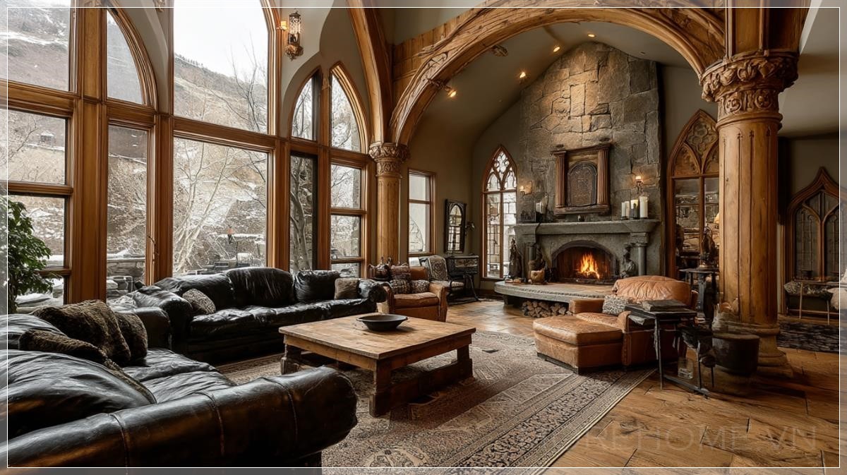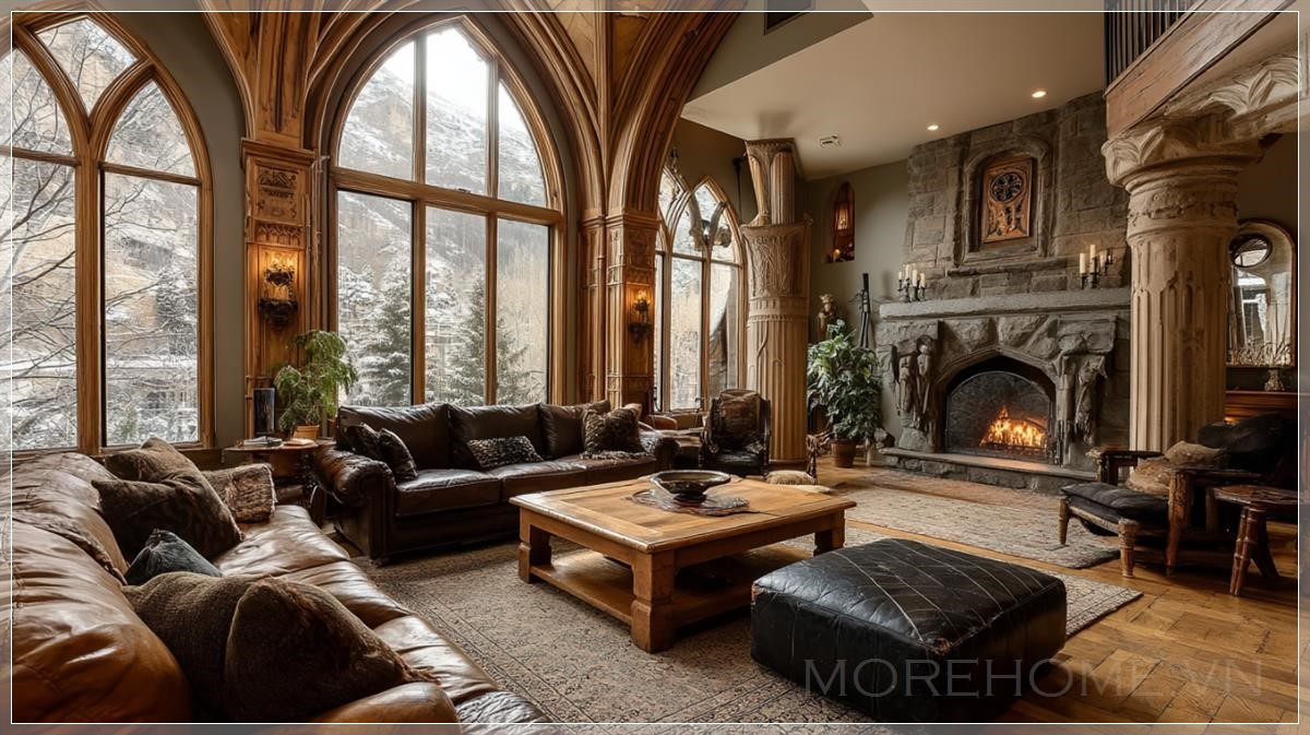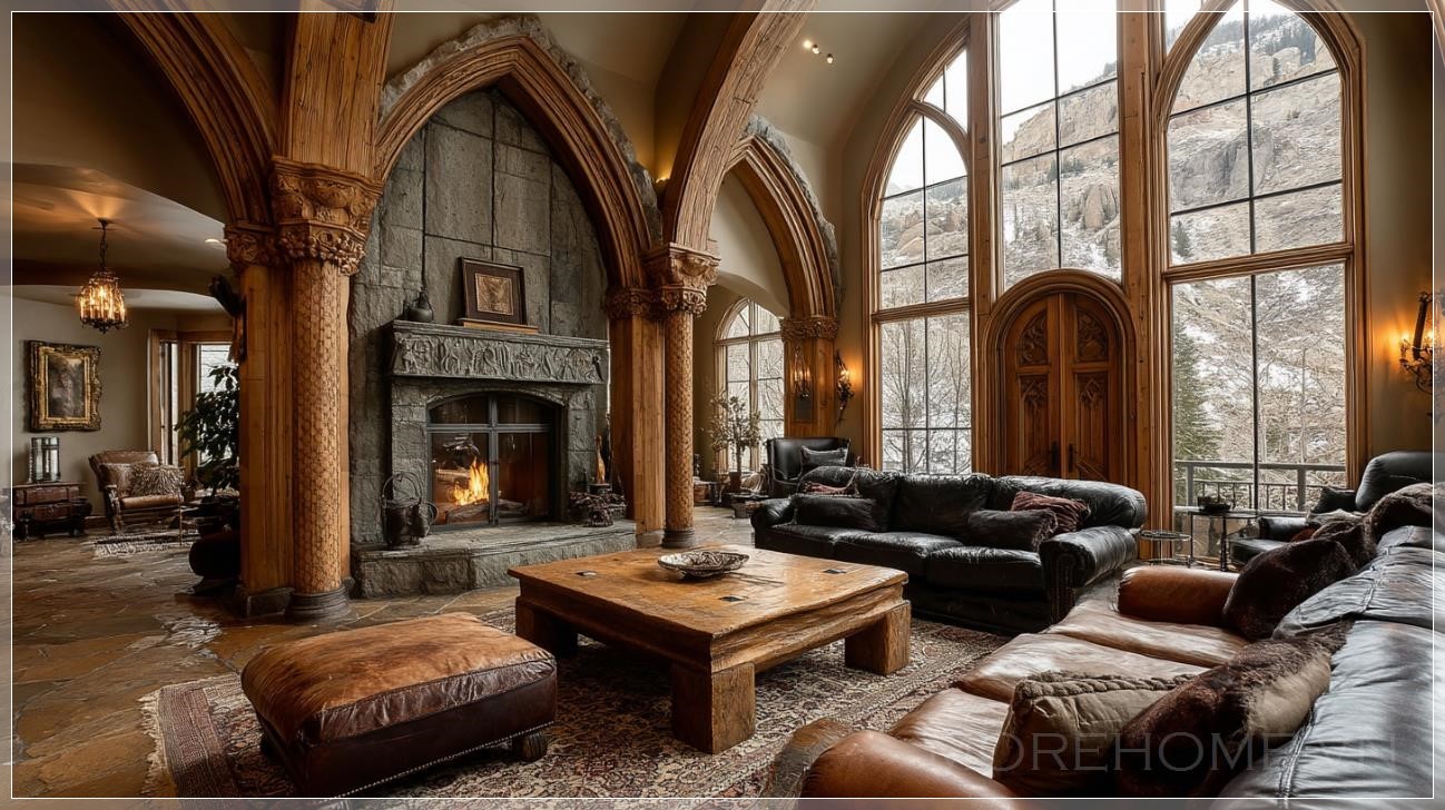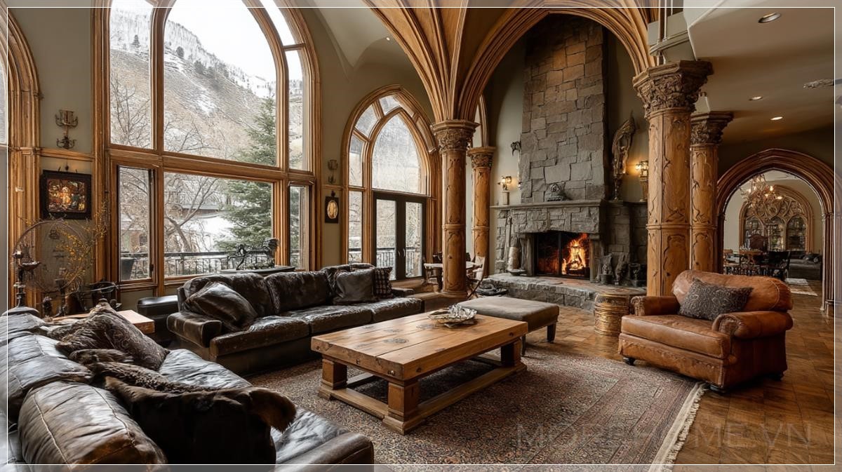 Phòng khách tuyệt đẹp của một biệt thự phong cách cabin Colorado với các yếu tố kiến trúc Gothic. Không gian ấm cúng và gần gũi, với những bức tường sáng màu. Các cột Gothic lớn tạo điểm nhấn. Lò sưởi lớn, tạo cảm giác ấm áp và thoải mái.