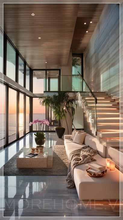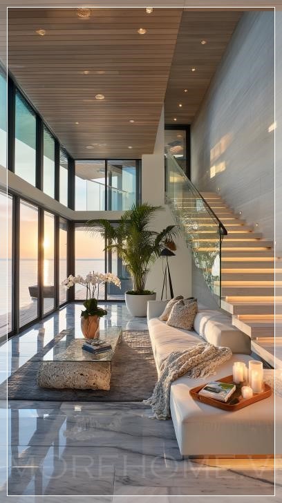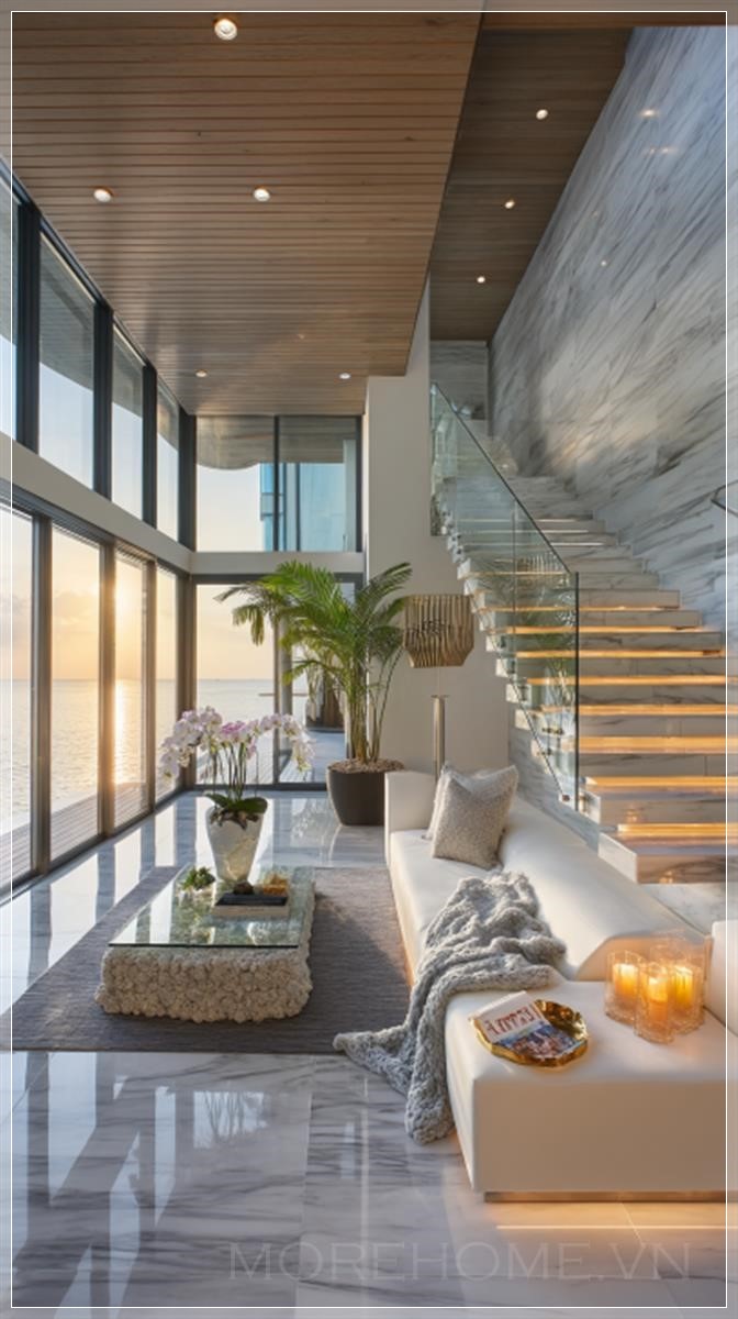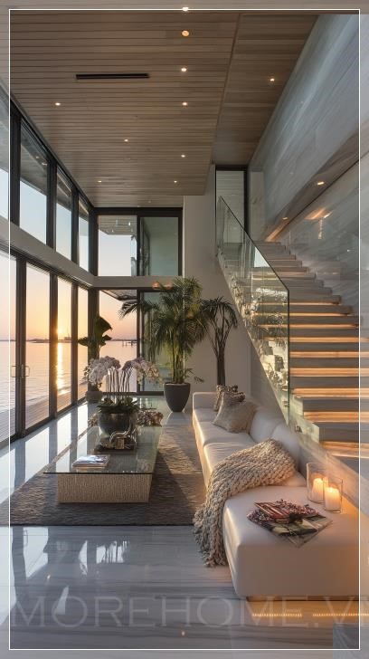 Ảnh chụp kiến trúc siêu thực của một không gian atrium hai tầng bằng kính vào giờ vàng, cầu thang đá cẩm thạch trắng nổi với đèn LED ấm dưới bậc, sàn đá xám đậm bóng loáng phản chiếu nến thật và đèn spot âm trần, tấm trần gỗ sồi sáng, cửa sổ từ sàn đến trần mở ra cảnh biển yên tĩnh. Nội thất gồm một bộ sofa trắng kiểu dáng thấp được trang trí bằng chăn có kết cấu, bàn cà phê mặt kính với bình gốm điêu khắc chứa hoa lan tươi, một tấm thảm lớn, đèn sàn đen mảnh mai và cụm cây cọ nhiệt đới và cây vả lá lớn trong chậu. Những tia nắng hoàng hôn nhẹ nhàng chiếu sáng tạo bóng dài, các phụ kiện con người tinh tế.