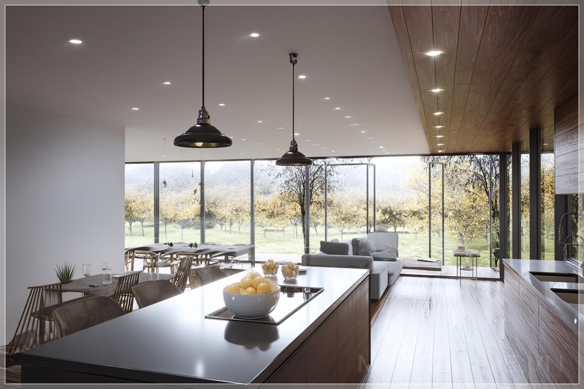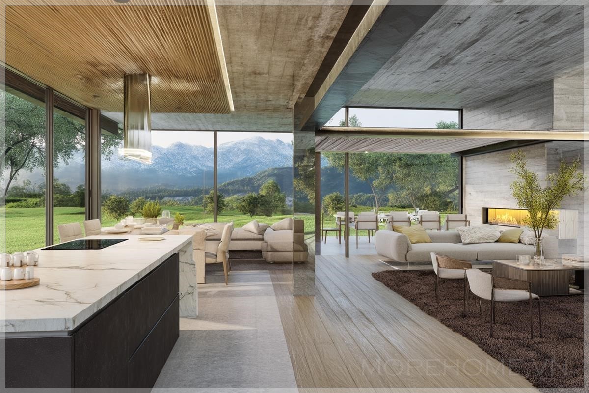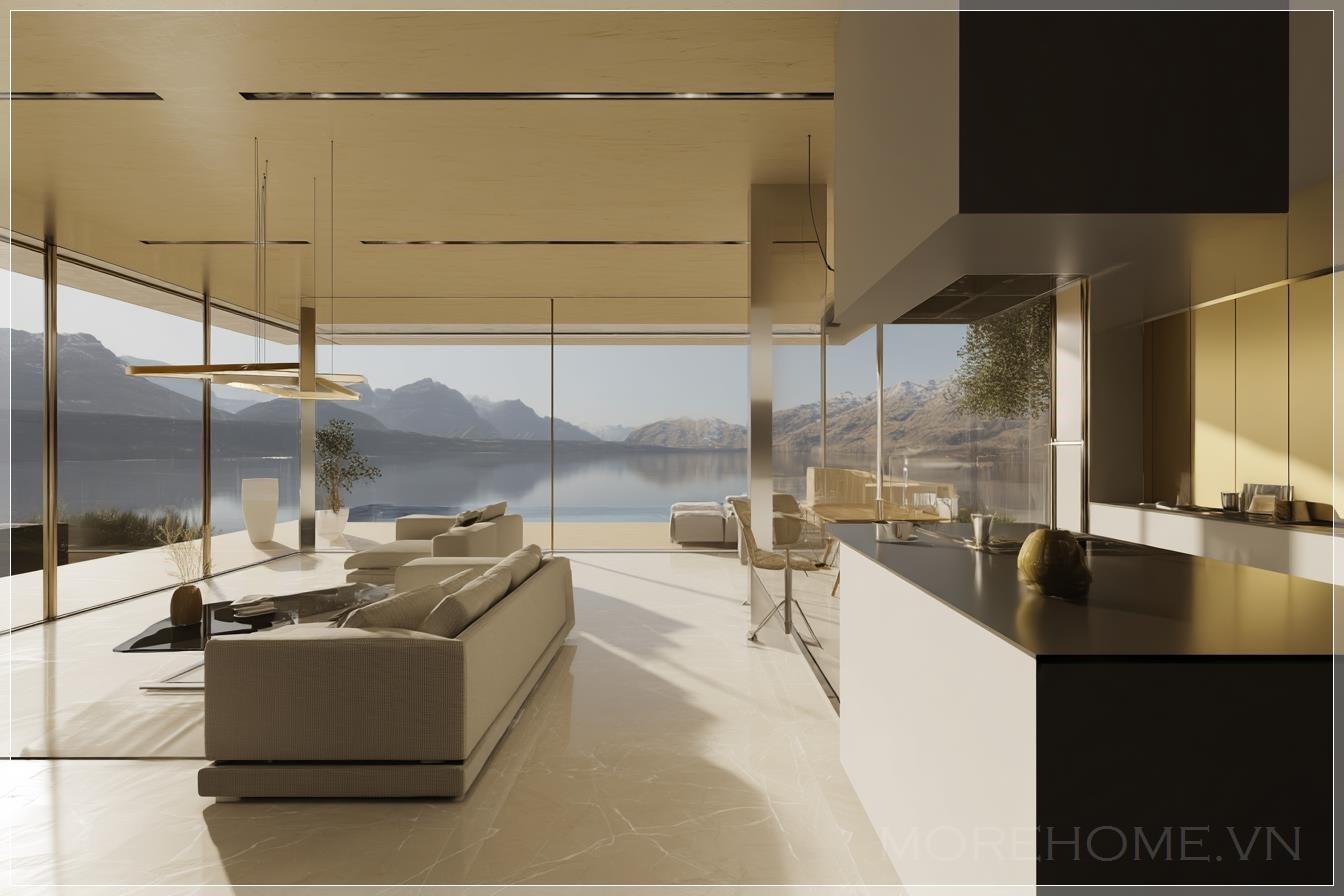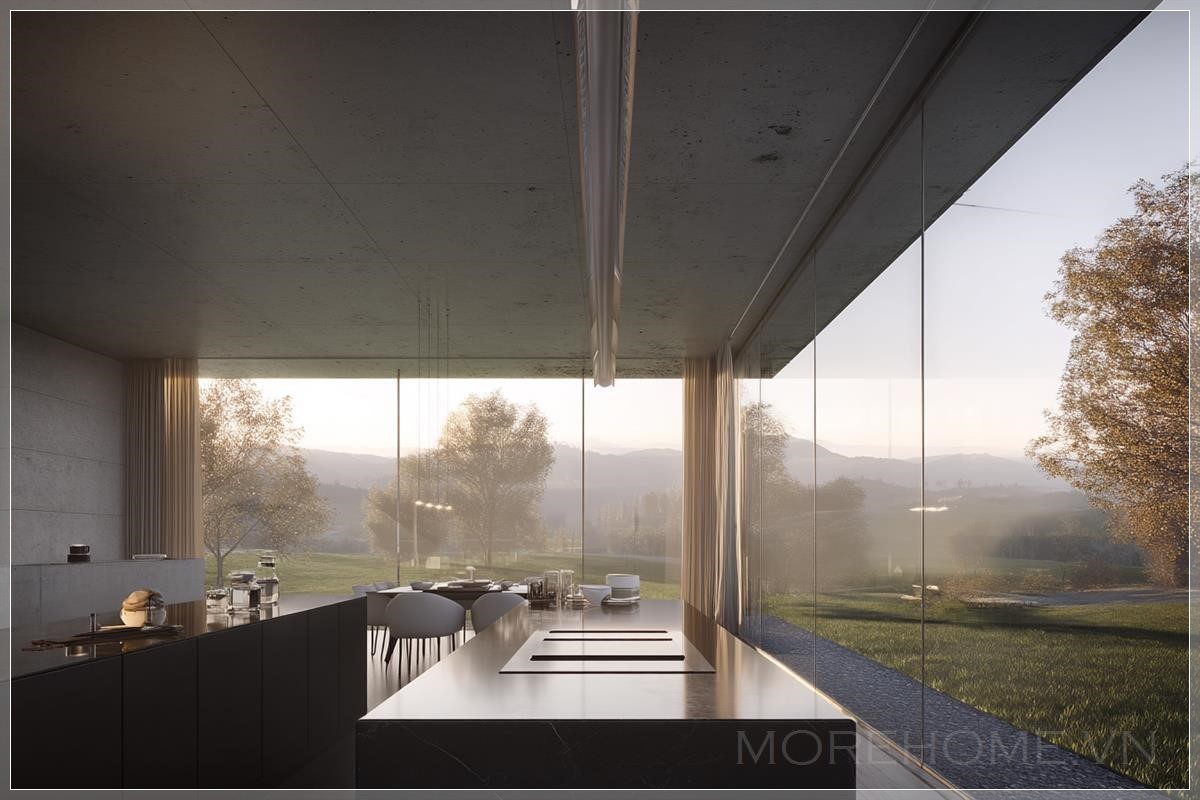 Tạo hình ảnh kiến trúc (render 3D) của một ngôi nhà sang trọng tuyệt đẹp. Di chuyển máy quay chậm, hiển thị không gian bếp và phòng khách với tầm nhìn tuyệt vời qua cửa kính. Làm cho video cực kỳ chân thực. Liên hệ: https://zalo.me/morehomevietnam