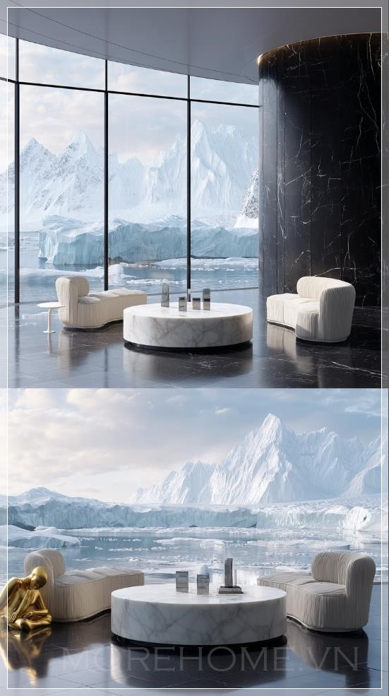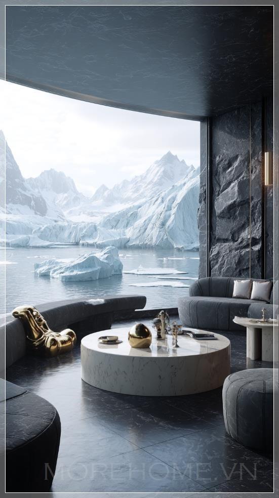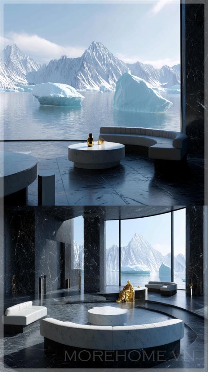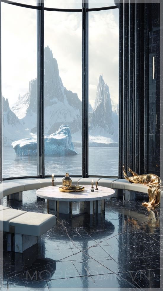 Phòng khách tương lai với nội thất hiện đại, thanh thoát và cửa sổ lớn nhìn ra phong cảnh băng giá của các tảng băng và núi. Những bức tường được ốp đá cẩm thạch đen, tạo nên một không gian sang trọng. Ở trung tâm là một bàn tròn làm từ đá trắng, xung quanh là ghế ngồi thoải mái cho bốn người. Một bức tượng vàng nằm ở một bên bàn, tăng thêm vẻ xa hoa cho không gian. Bên ngoài, có một tảng băng trôi trên mặt nước gần những đỉnh núi.