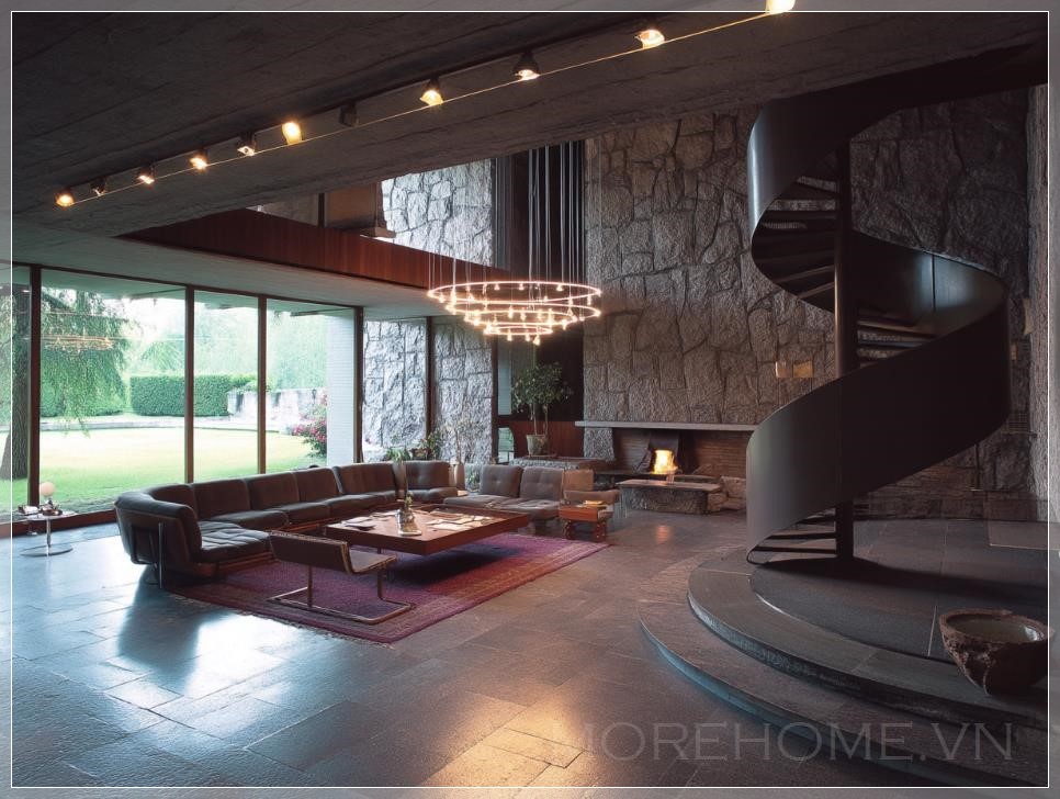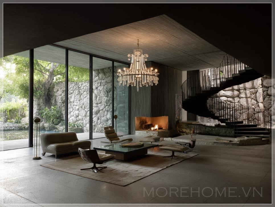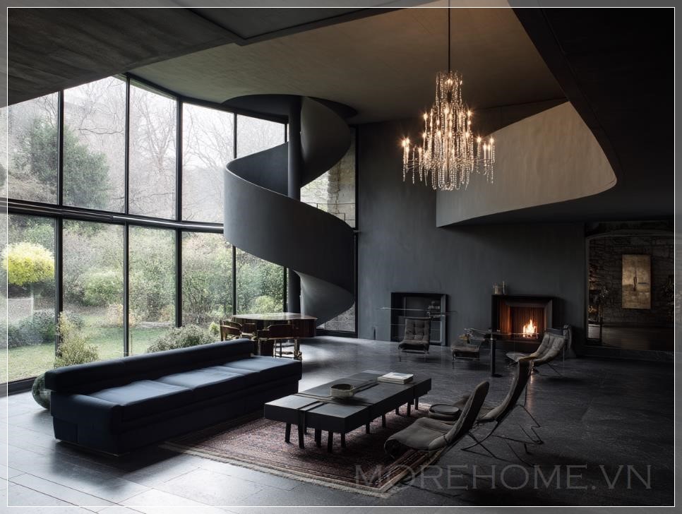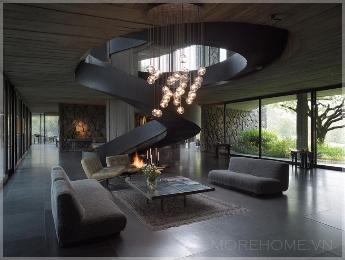 Phòng khách của biệt thự được thiết kế bởi Valerio Olgiati có không gian hai tầng, cầu thang xoắn ốc tối màu, sàn đá mờ, và một chiếc đèn chùm treo trên bàn sofa. Ghế lounge được đặt xung quanh lò sưởi, các bức tường được ốp đá, và không gian được chiếu sáng bởi một chiếc đèn chùm hiện đại. Các cửa sổ kính lớn mở ra tầm nhìn ra khu vườn.