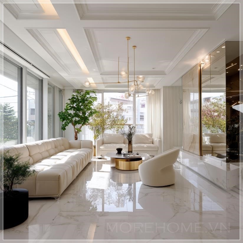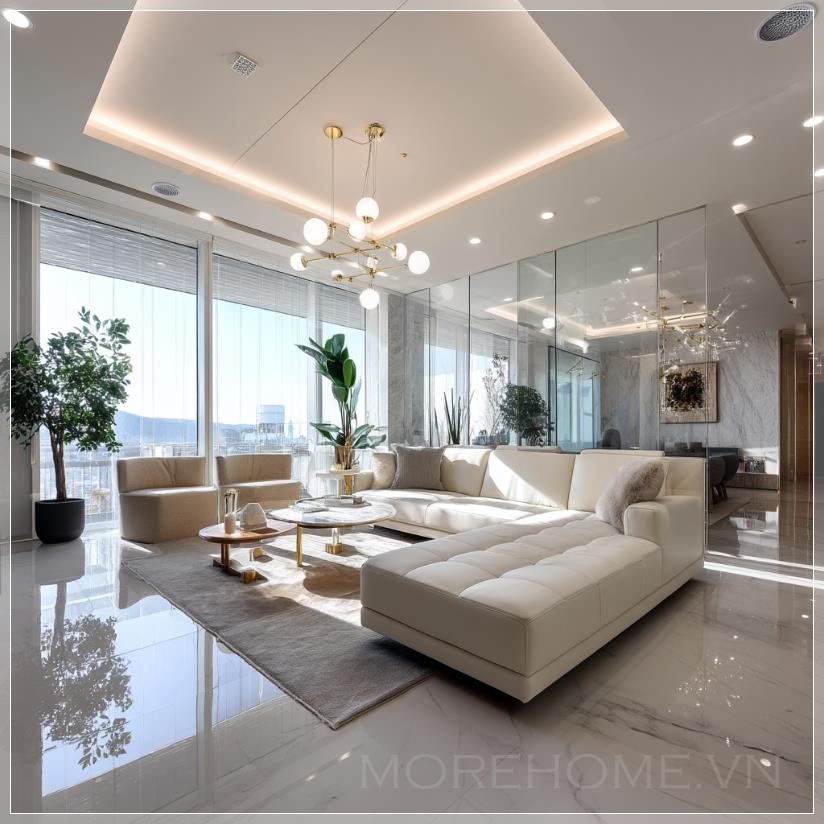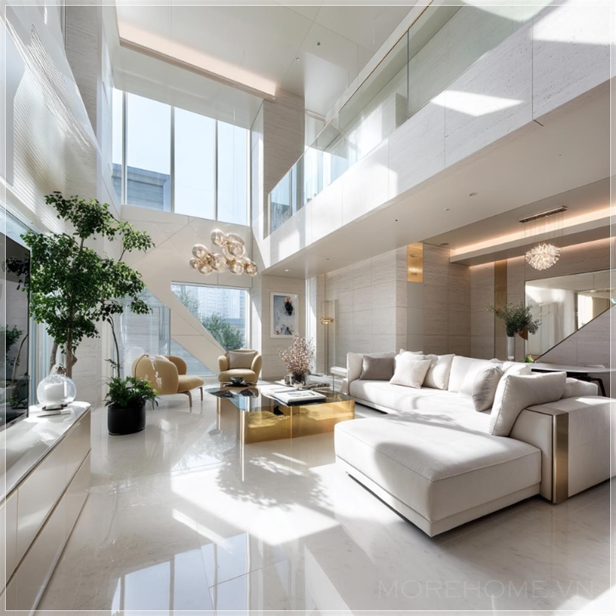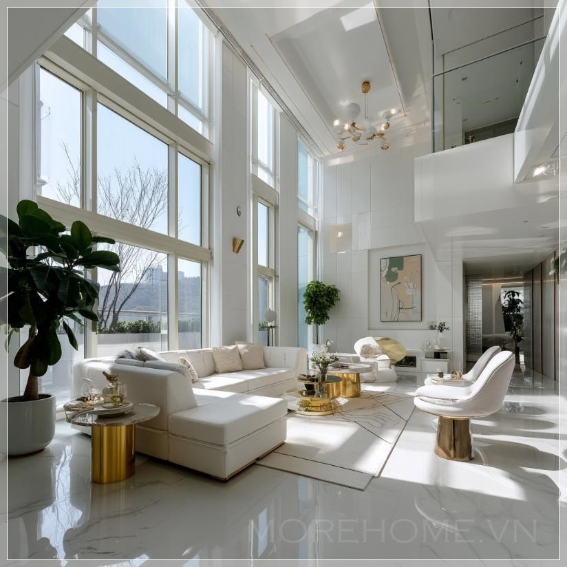 Không gian trắng tuyệt đối: Các bức tường, trần nhà và đồ nội thất chính được sử dụng tông trắng hoặc kem sáng để tối đa hóa hiệu ứng không gian sạch sẽ và rộng rãi. Ánh sáng tự nhiên phong phú: Ánh nắng chiếu qua các cửa sổ lớn làm sáng bừng không gian, tạo cảm giác ấm áp. Rèm cửa bằng chất liệu mỏng và trong suốt giúp lọc ánh sáng một cách nhẹ nhàng. Vật liệu sang trọng: Sử dụng đá cẩm thạch, bề mặt bóng, vải cao cấp và điểm nhấn kim loại nhẹ màu vàng hoặc bạc để tăng thêm sự sang trọng. Bố trí nội thất tinh tế: Ghế sofa và ghế bành thiết kế tinh tế, bàn cà phê được bố trí ổn định theo góc nhìn trực diện, tạo cảm giác vững chãi. Trang trí tối giản: Các món đồ trang trí được giảm thiểu để không làm rối không gian, nhưng các điểm nhấn như ánh sáng nghệ thuật, tác phẩm nghệ thuật và cây xanh tươi mát đã làm tăng thêm vẻ thanh lịch. Năng lượng tươi sáng và tích cực: Toàn bộ không gian tràn ngập năng lượng tích cực, mang đến một không gian thư giãn, thoải mái và đầy sự thanh lịch.