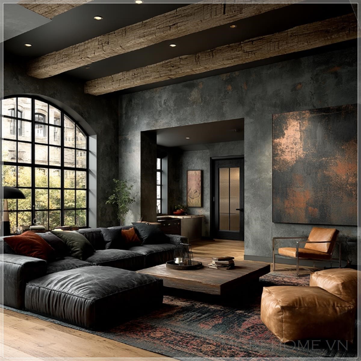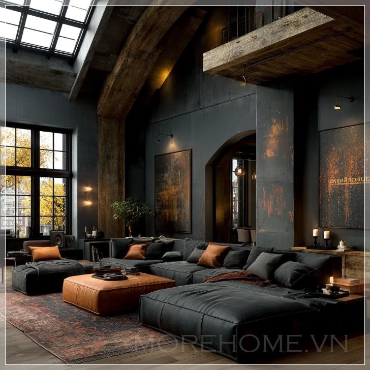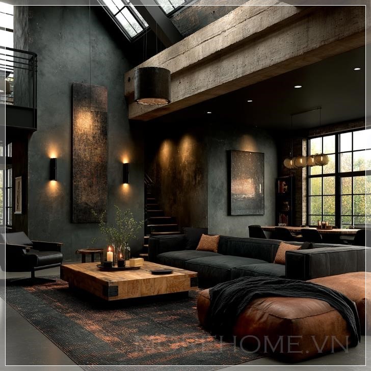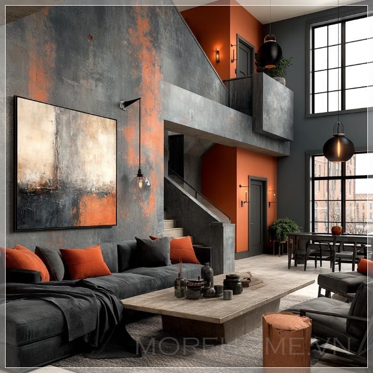 Phòng khách mở trong thiết kế bất động sản cao cấp, với kiến trúc Industrial Loft chi tiết. Màu sắc chủ đạo là than chì và đồng, mang lại vẻ đẹp tinh tế nhưng sang trọng, với nội thất hiện đại và những tác phẩm nghệ thuật đẹp mắt trên canvas.
