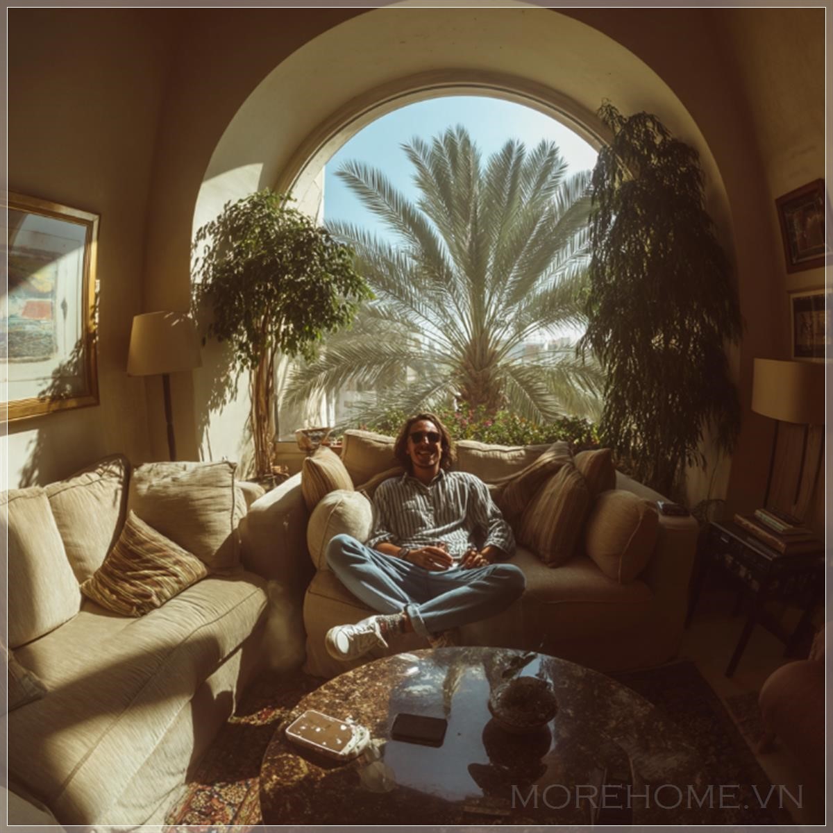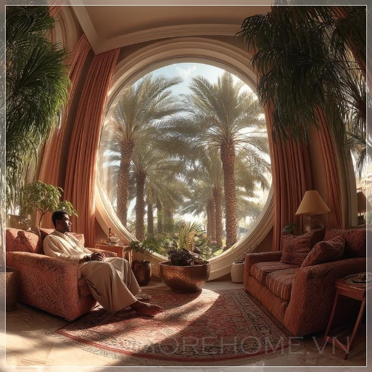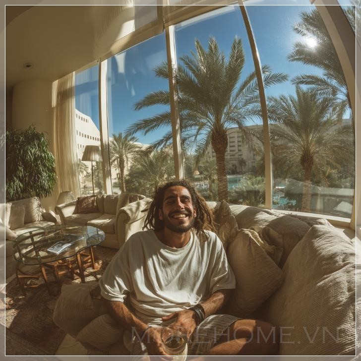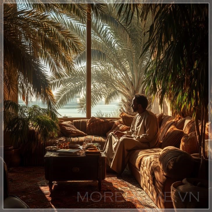 Một người đàn ông Ả Rập vui vẻ đang ngồi trên sofa, góc rộng, nhìn thấy những cây cọ ở vịnh qua cửa sổ. Liên hệ: https://zalo.me/morehomevietnam