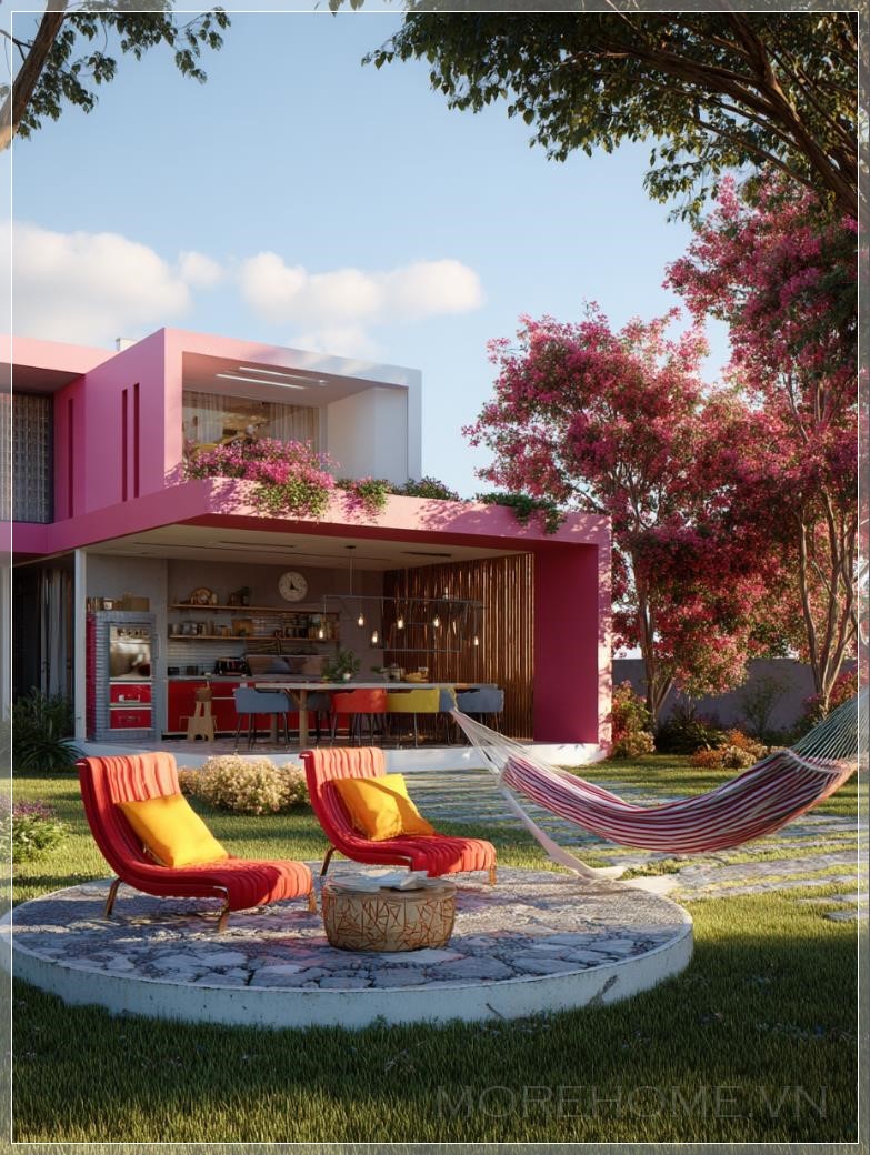 Các loại cây xanh được lựa chọn kỹ lưỡng, bao gồm những cây hoa rực rỡ sắc màu, tạo nên một cảnh quan sống động và dễ chịu. Chúng được đặt trong những chậu hoa lớn, tô điểm thêm cho không gian ngoại thất, mang đến một bức tranh thiên nhiên tràn ngập sắc màu. Một chiếc võng treo nhẹ nhàng giữa không gian mở là nơi lý tưởng để thư giãn dưới bóng mát của những tán cây.