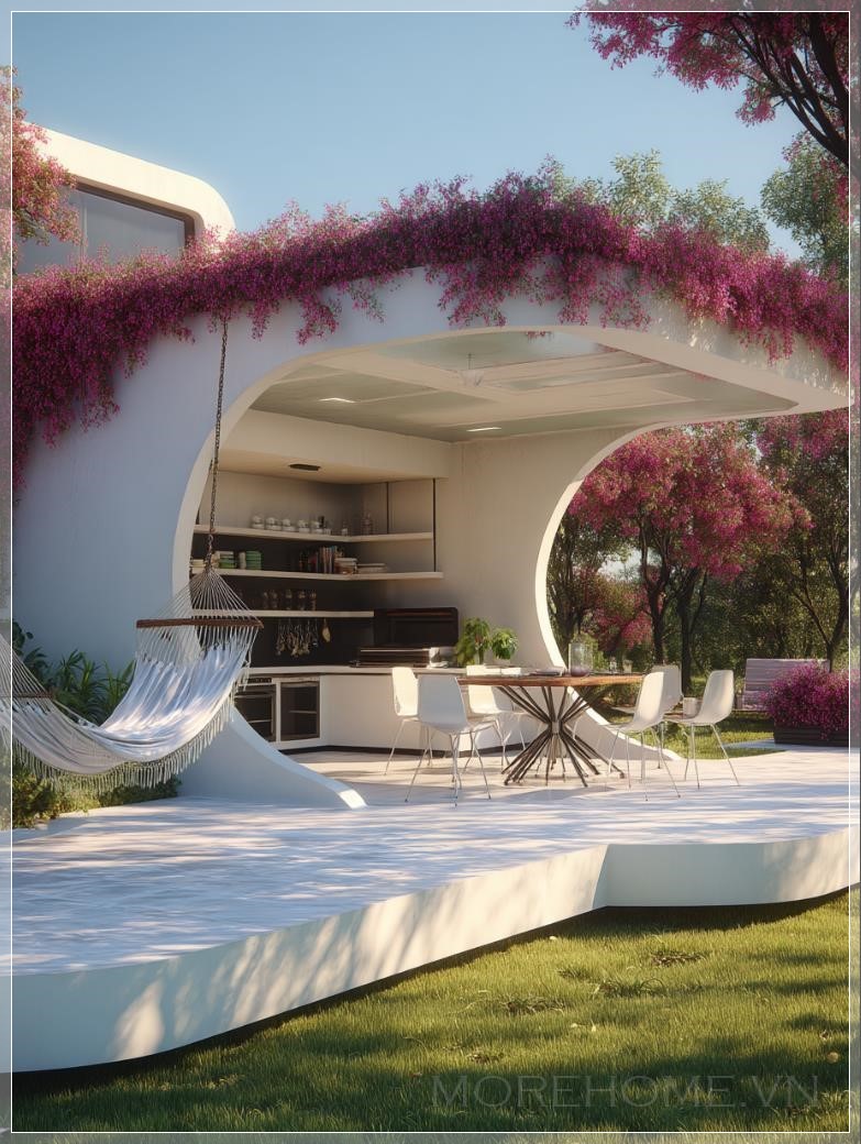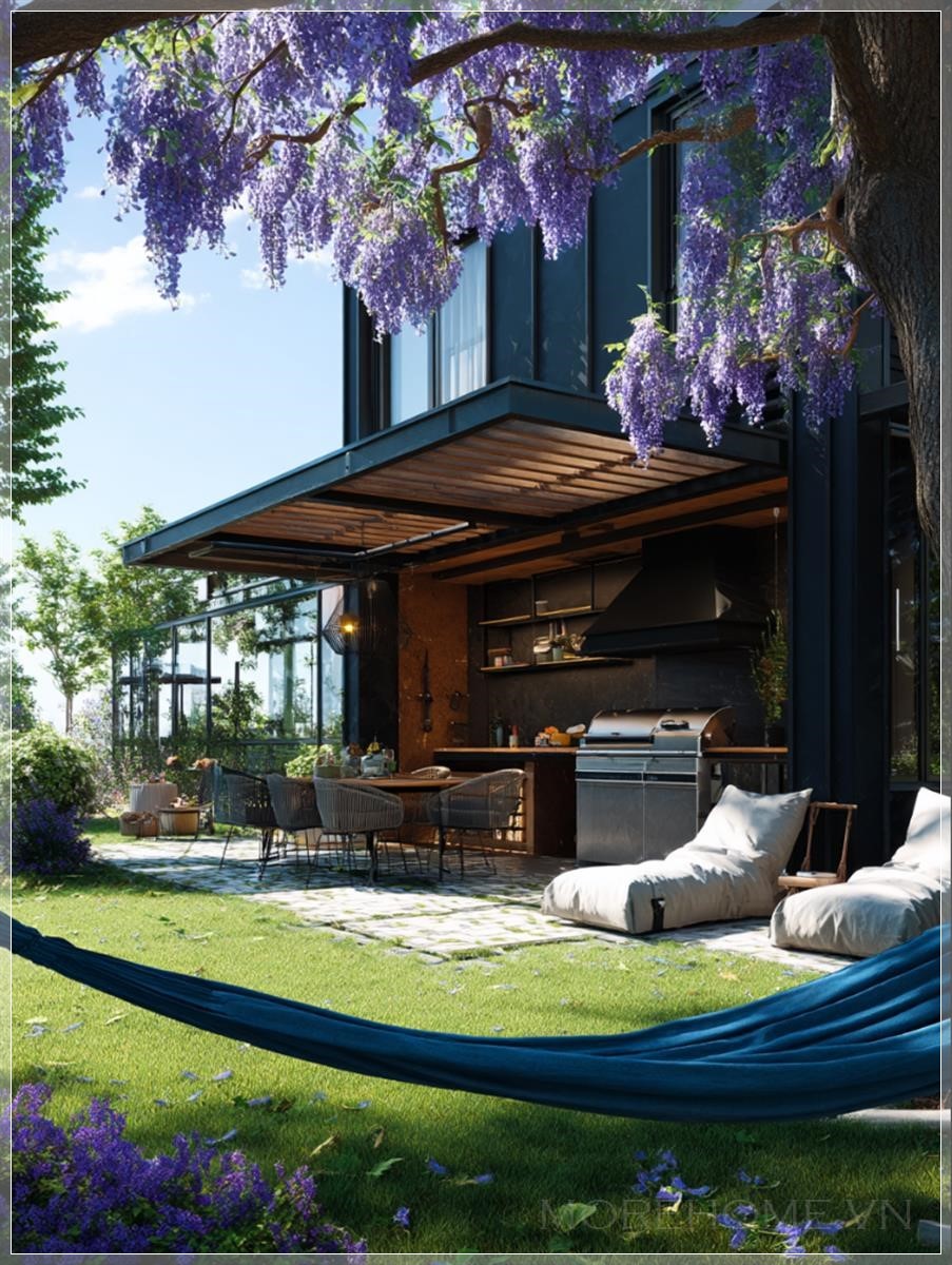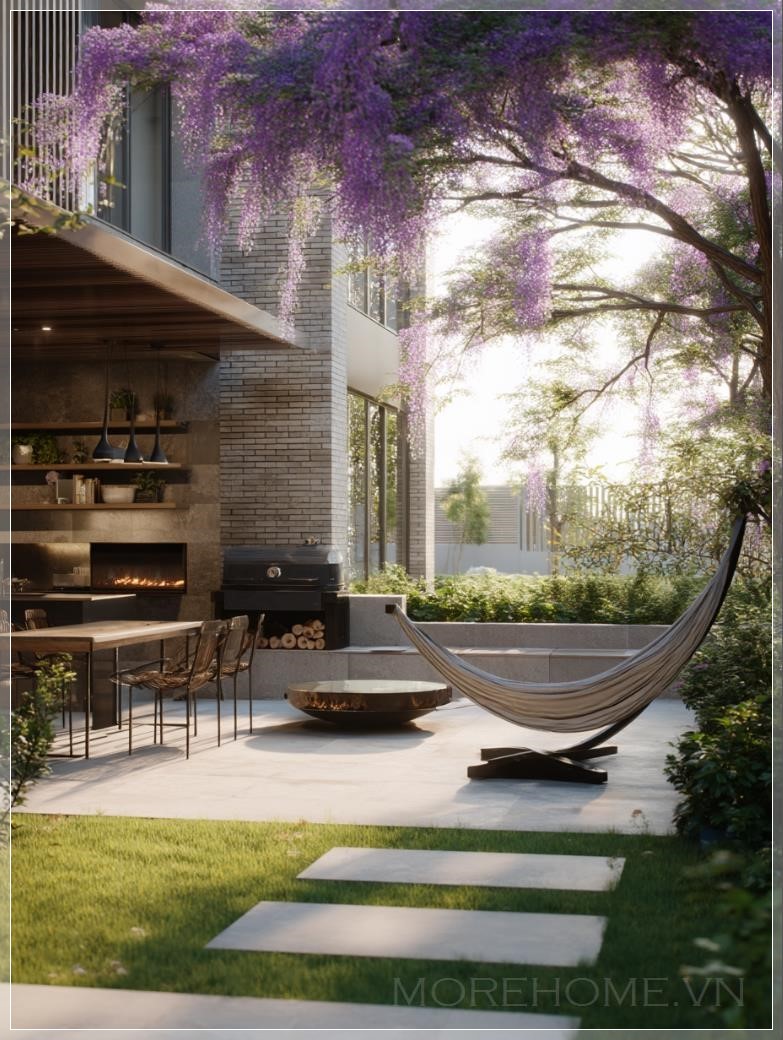 Những chiếc ghế mây thanh lịch và bàn ăn ngoài trời bằng chất liệu kim loại cao cấp không chỉ mang lại sự thoải mái mà còn làm nổi bật vẻ đẹp tối giản nhưng vô cùng tinh tế của không gian. Một quầy nướng BBQ hiện đại, kết hợp với các kệ trang trí tinh xảo, là điểm nhấn cho những buổi tối quây quần cùng gia đình và bạn bè.