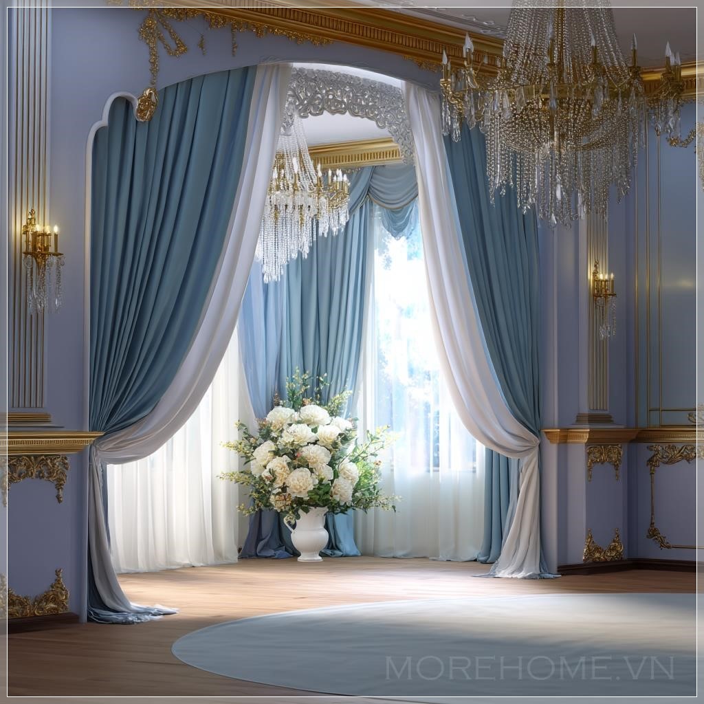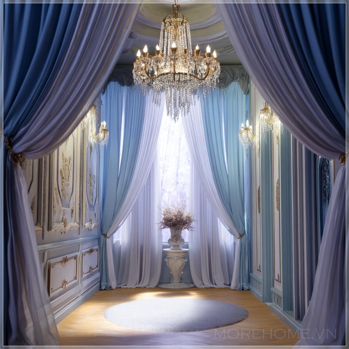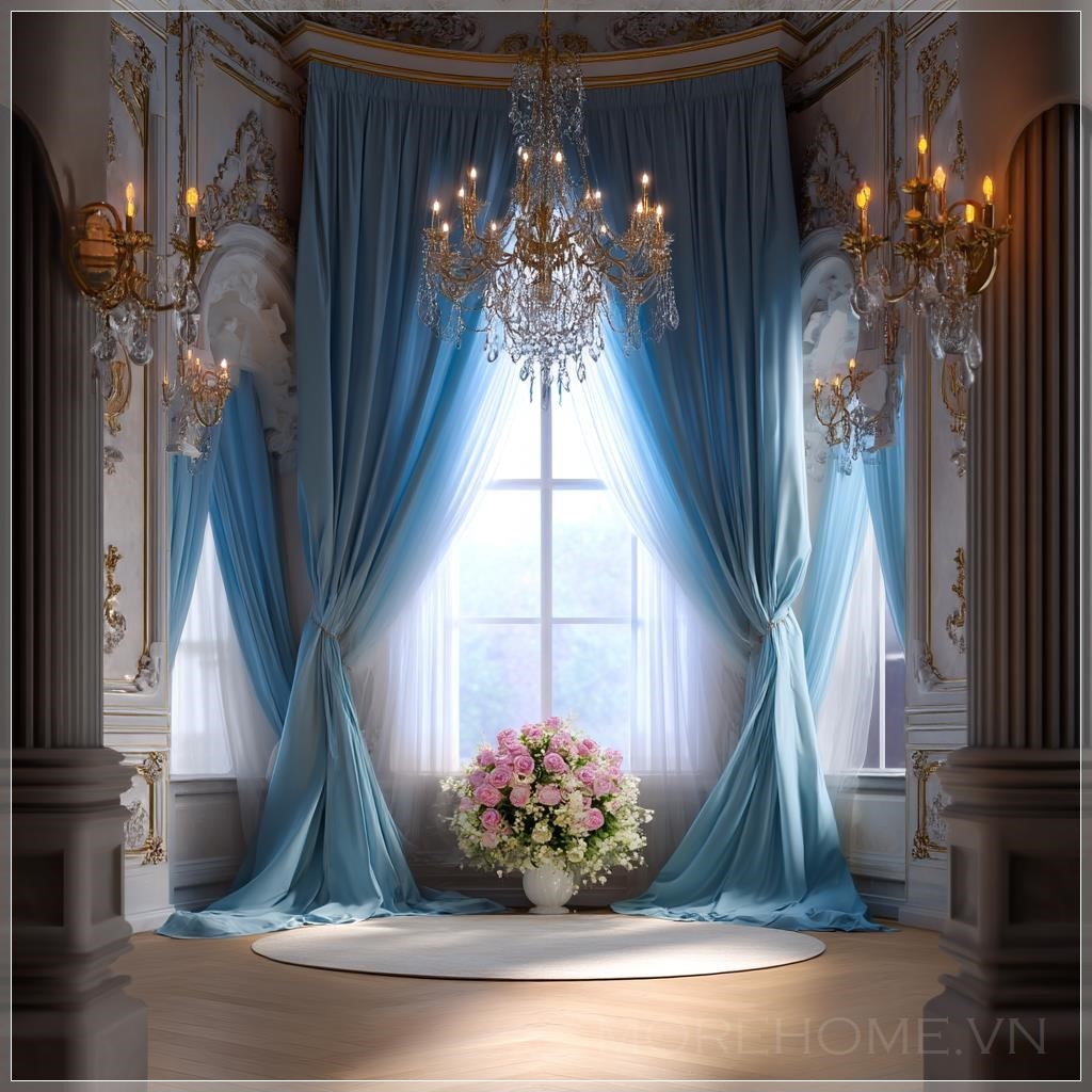 Trong không gian sang trọng mang đậm phong cách Rococo, sự kết hợp hoàn hảo giữa sự tinh tế và lộng lẫy là điều không thể không nhắc đến. Những chiếc rèm vải xanh lam và trắng nhẹ nhàng buông rủ qua các cửa sổ cổ điển cao, làm cho ánh sáng dịu dàng chiếu qua những tấm rèm mỏng, tạo nên một không gian nhẹ nhàng và thư thái. Đèn chùm pha lê tinh xảo treo lơ lửng trên trần nhà, phản chiếu ánh sáng ấm áp, làm nổi bật các đường viền hoa văn trên các bức tường được trang trí cầu kỳ.