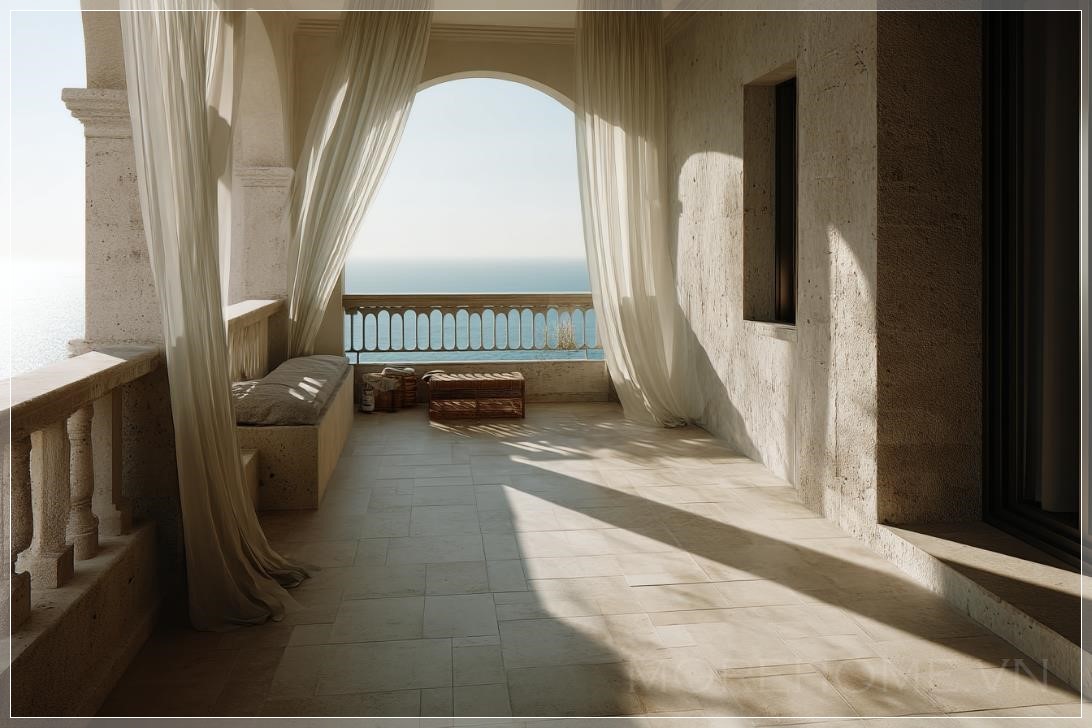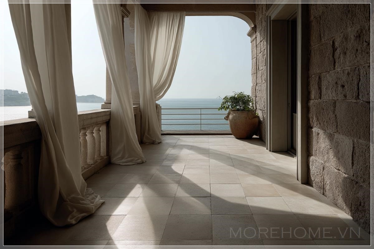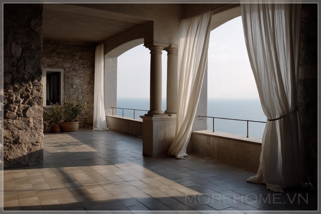 Ánh nắng chiều nghiêng mình qua những tấm rèm vải lanh trắng, tạo nên một vũ điệu ánh sáng và bóng tối trên nền gạch đá nhẵn mịn. Từ ban công đá yên tĩnh này, toàn cảnh bờ biển Ý hiện ra như một bức tranh sống động, nơi mà thời gian dường như ngừng trôi.