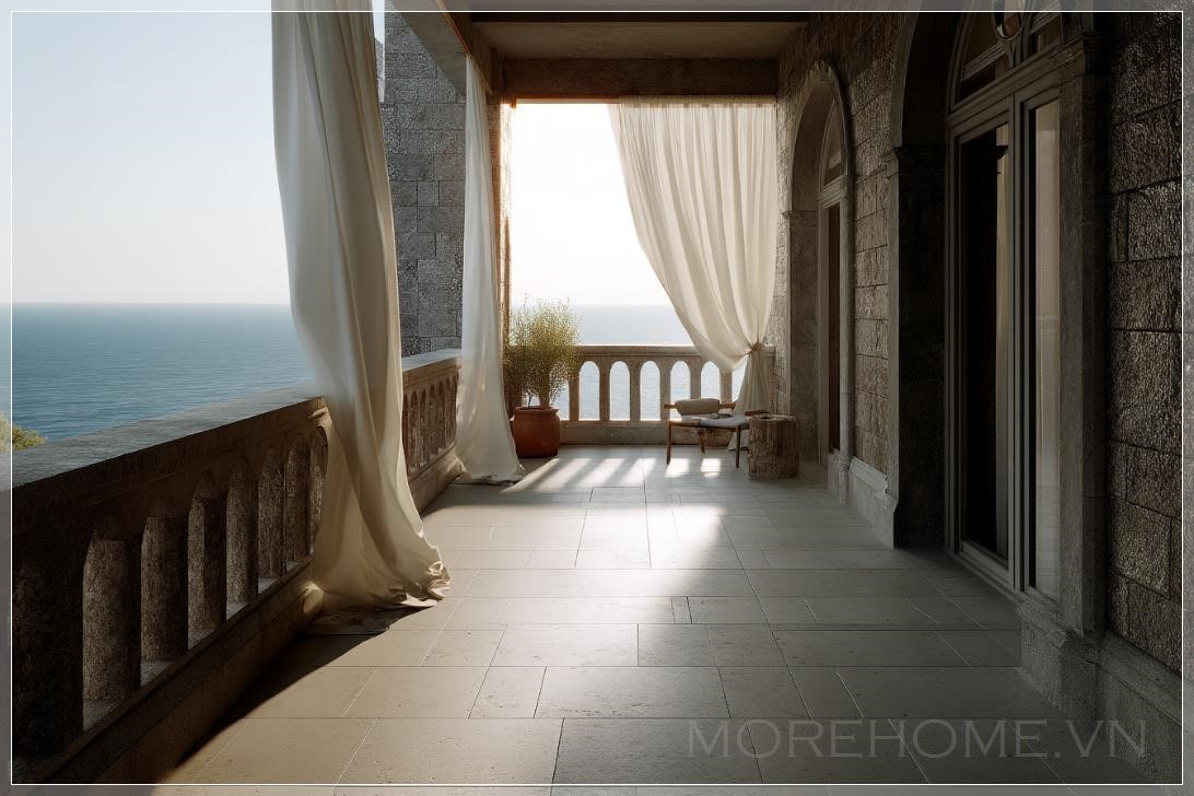 Tôi đã luôn tin rằng những khoảnh khắc đẹp nhất trong cuộc sống thường đến từ những điều giản đơn nhất. Ngồi đây, trên ban công đá cổ kính với những viên gạch màu nhạt, tôi cảm nhận được sự êm ái của làn gió biển nhẹ nhàng vuốt ve làn da. Rèm vải lanh trắng khẽ lay động, như thể chúng đang thì thầm những câu chuyện của biển cả.