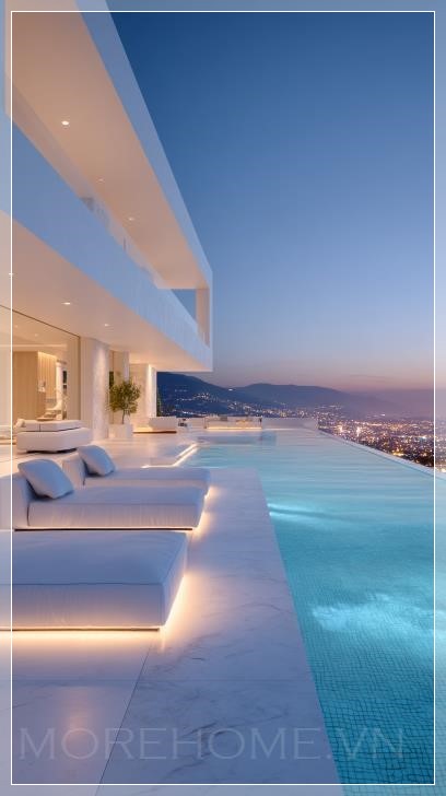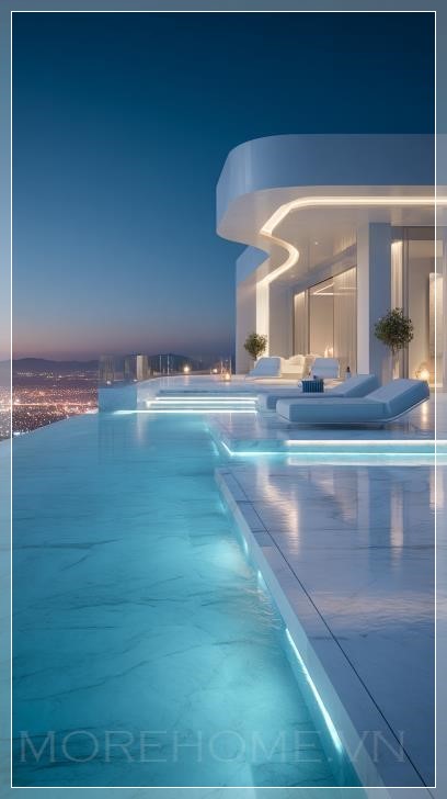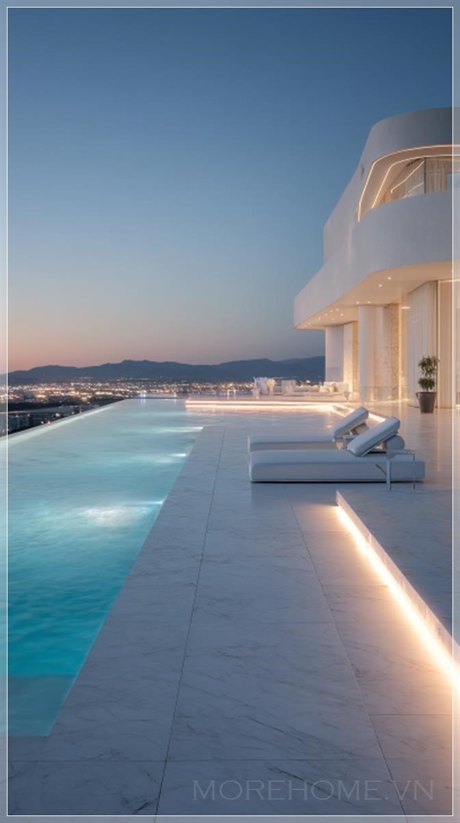 Hồ bơi vô cực là điểm nhấn đặc biệt của toàn bộ thiết kế. Mặt nước phẳng lặng như một tấm gương khổng lồ, phản chiếu dải đèn LED trắng được tích hợp tinh tế vào cạnh và đáy hồ. Đây không chỉ là một hồ bơi thông thường mà là một tác phẩm nghệ thuật ánh sáng, nơi ranh giới giữa nước và không khí trở nên mơ hồ, tạo cảm giác không gian vô tận.