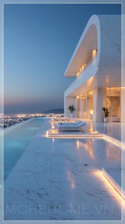 Khi màn đêm buông xuống, biệt thự siêu sang này trở thành một kiệt tác ánh sáng giữa không gian tĩnh lặng. Những đường nét kiến trúc tương lai với màu trắng tinh khôi nổi bật trên nền trời đêm, tạo nên một khung cảnh gần như siêu thực nhưng đồng thời lại mang đến cảm giác bình yên đến kỳ lạ.