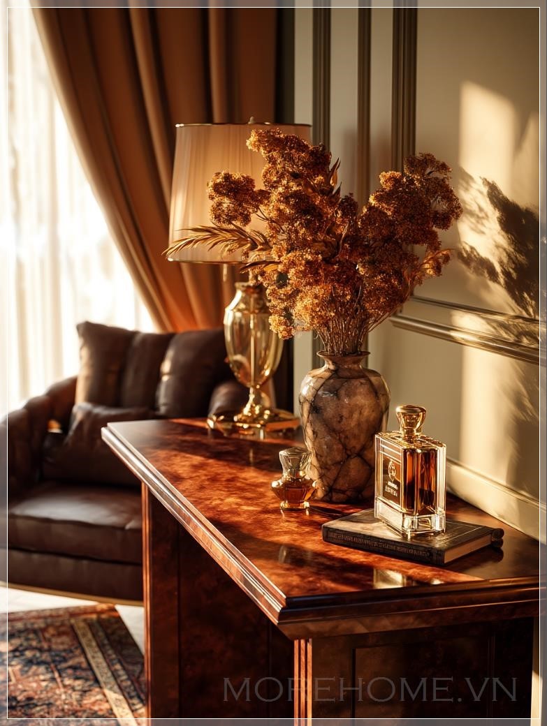 Trong không gian phòng khách sang trọng, chiếc bàn console mang đậm màu gỗ gụ đứng yên lặng dưới ánh đèn vàng ấm áp. Đây không chỉ là một món đồ nội thất đơn thuần, mà còn là tâm điểm của câu chuyện về sự tinh tế trong nghệ thuật trang trí nhà ở hiện đại.