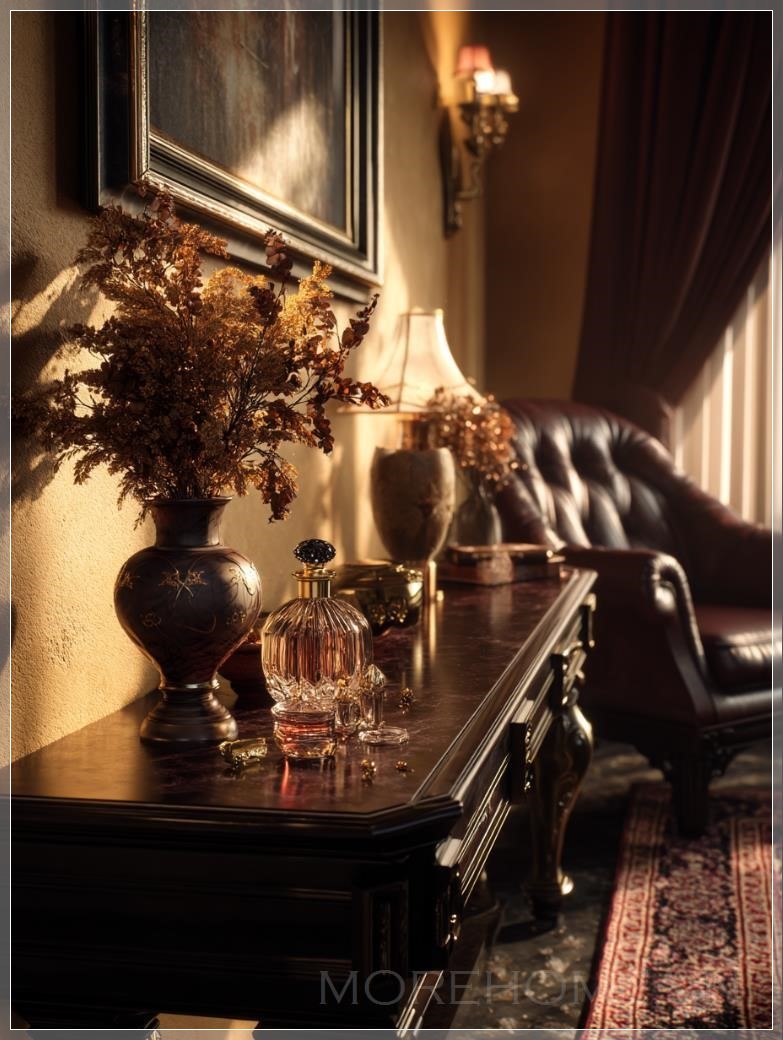 Trên mặt bàn, một chai nước hoa pha lê với nắp vàng óng ánh đứng kiêu hãnh, bên cạnh là một bình gốm sứ thanh lịch cắm những bông hoa khô màu hổ phách. Dưới ánh đèn vàng ấm, những chi tiết nhỏ nhất của các món đồ trang trí cũng được làm nổi bật - từ những đường nét tinh xảo trên chai nước hoa pha lê đến từng cánh hoa khô với kết cấu phong phú. Ánh sáng ấm áp ôm lấy từng đường nét, tạo nên một bức tranh tĩnh vật sống động giữa không gian tối.
