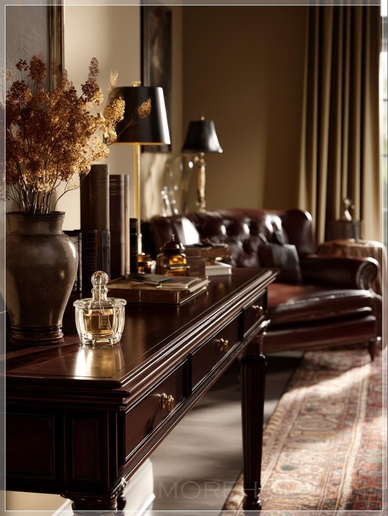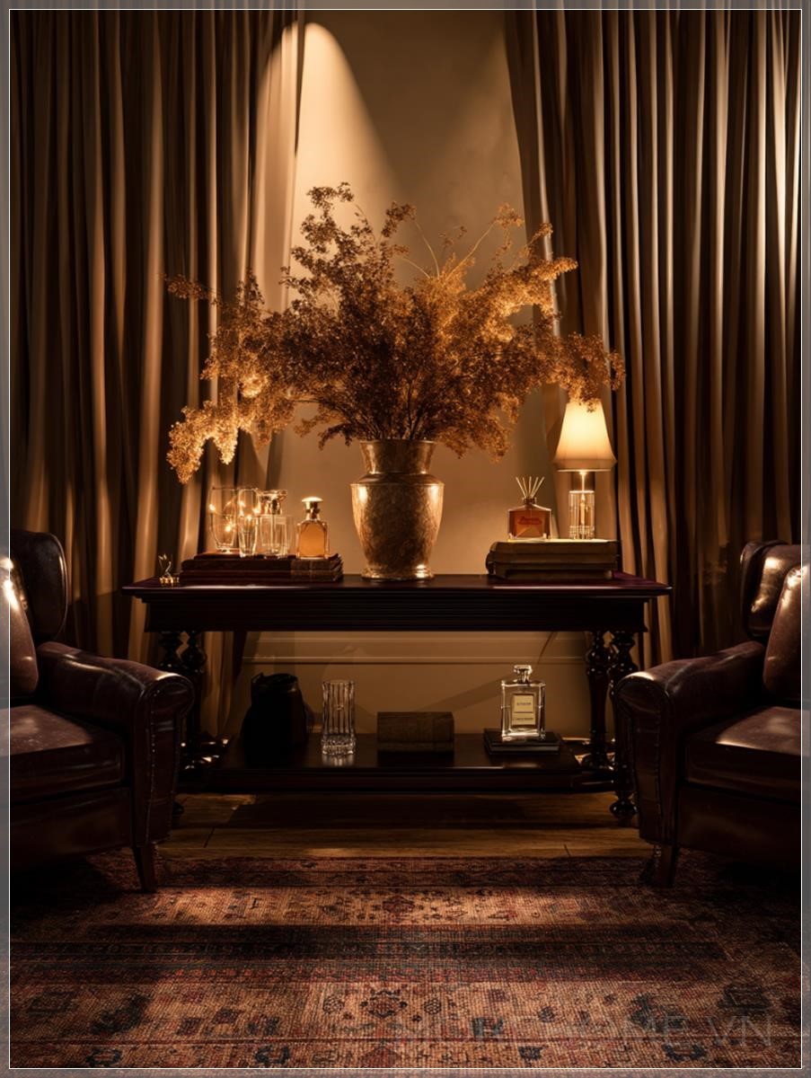 Xung quanh chiếc bàn console, những chiếc ghế bành bọc da nâu sẫm mời gọi người ngồi thư giãn, trong khi những tấm rèm nhung nặng nề khung cảnh như một tác phẩm nghệ thuật được đóng khung hoàn hảo. Dưới chân, tấm thảm len kiểu Ba Tư với những họa tiết phức tạp neo giữ không gian, kết nối tất cả các yếu tố lại với nhau trong một tổng thể hài hòa.