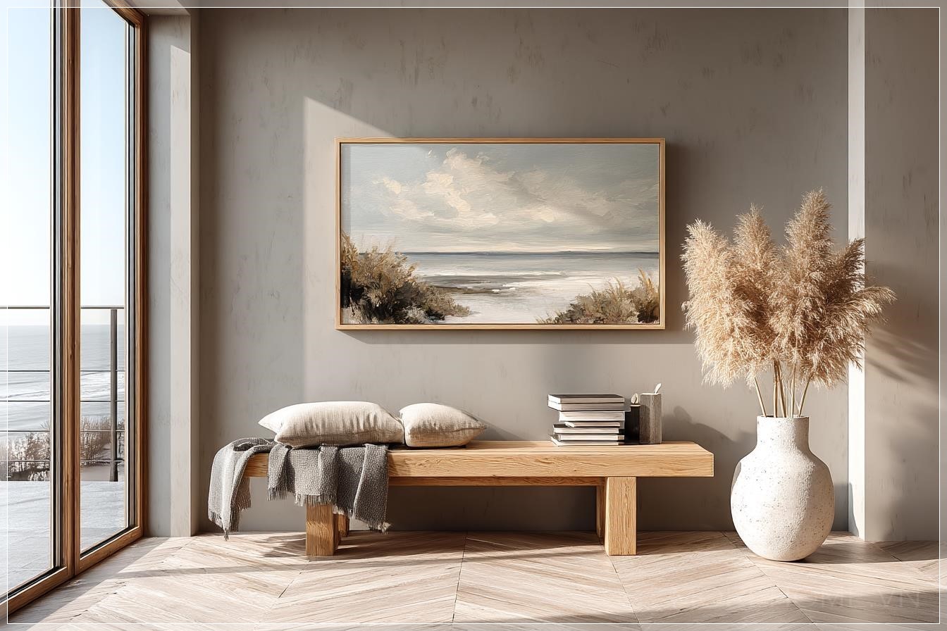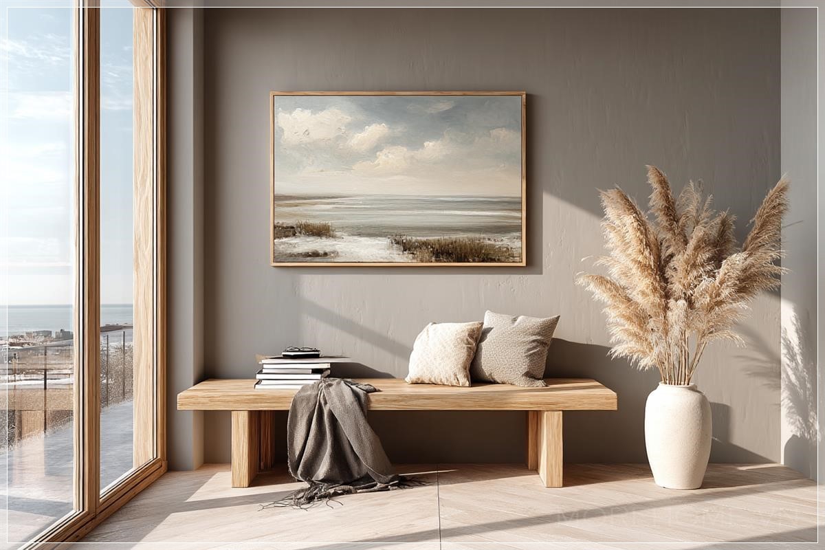 Phía dưới bức tranh, một chiếc băng ghế hoặc tủ console bằng gỗ sồi nhạt màu được bố trí một cách có chủ ý. Trên đó, một chiếc bình gốm trắng đựng cỏ pampas khô, một chồng sách đen trắng được xếp gọn gàng, và một tấm vải lanh xám được gấp cẩn thận. Mỗi vật dụng đều có vai trò riêng trong việc tạo nên bức tranh tổng thể, không quá nhiều nhưng cũng không thiếu thốn.