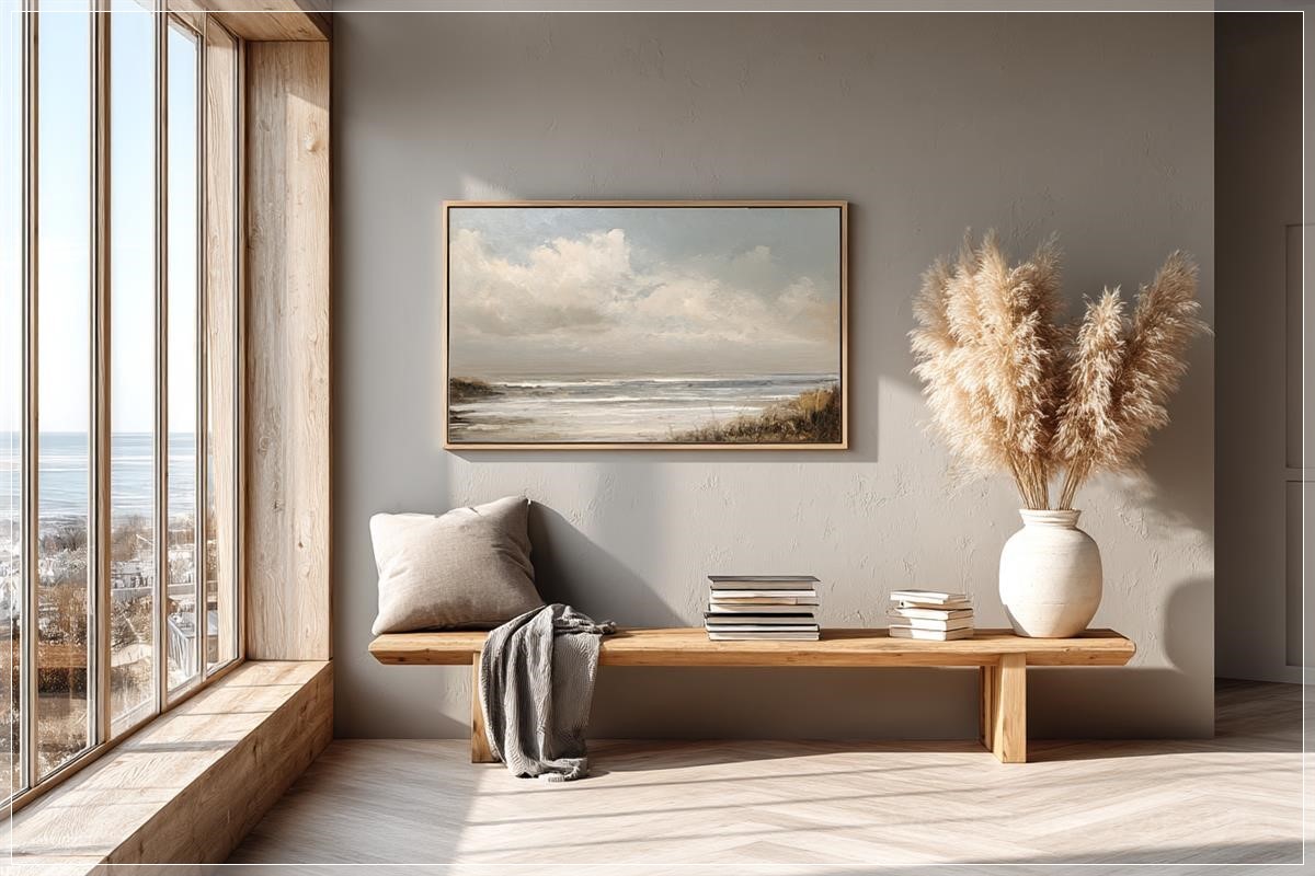 Hãy tưởng tượng bức tranh sơn dầu nằm ngang với kích thước 61x150cm được treo trên bức tường màu xám trung tính, được bao quanh bởi khung gỗ sồi sáng màu với đường nét tối giản và lớp phủ mờ tinh tế. Tỷ lệ 2.46:1 của bức tranh tạo nên một dải ngang rộng, như một cửa sổ mở ra thế giới nghệ thuật, vừa trang trọng vừa gần gũi với không gian sống.