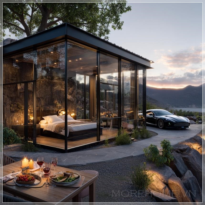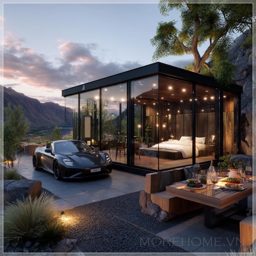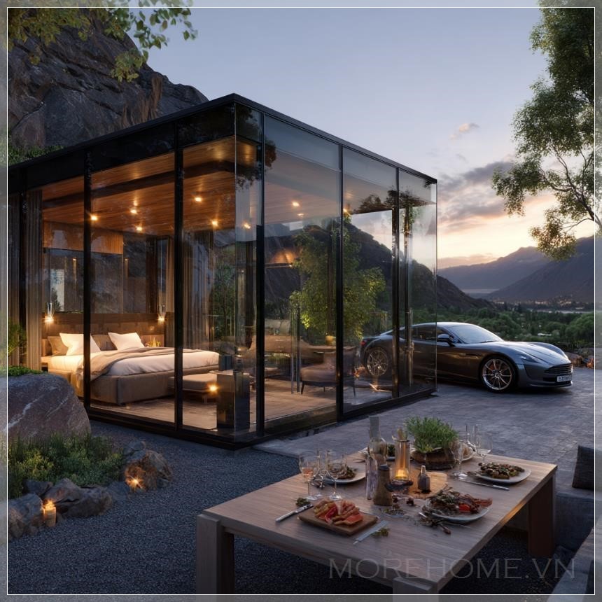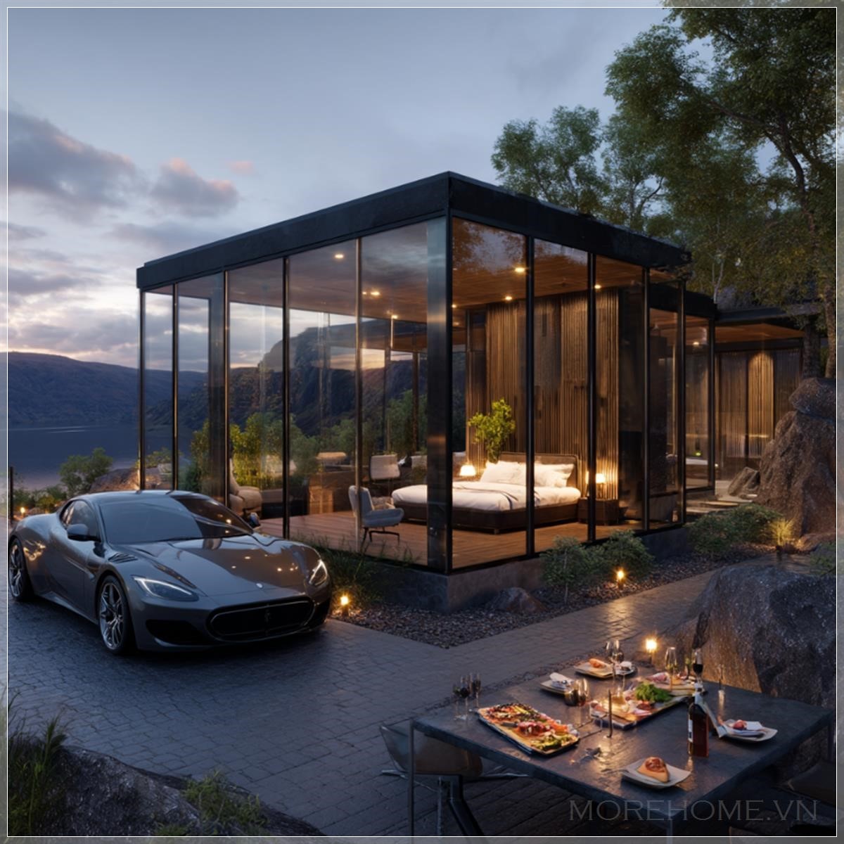 Vị trí đặc biệt của ngôi nhà, ẩn mình trong khung cảnh thiên nhiên tuyệt đẹp, tạo nên một trải nghiệm sống độc đáo. Mỗi buổi sáng thức dậy là một lần được chào đón bình minh qua những tấm kính trong suốt, mỗi buổi tối là cơ hội ngắm nhìn hoàng hôn nhuộm màu trên bầu trời rộng lớn.