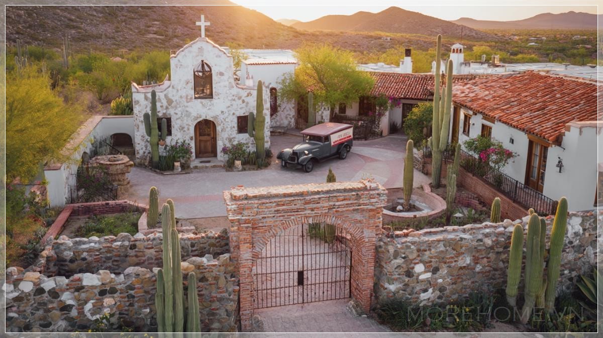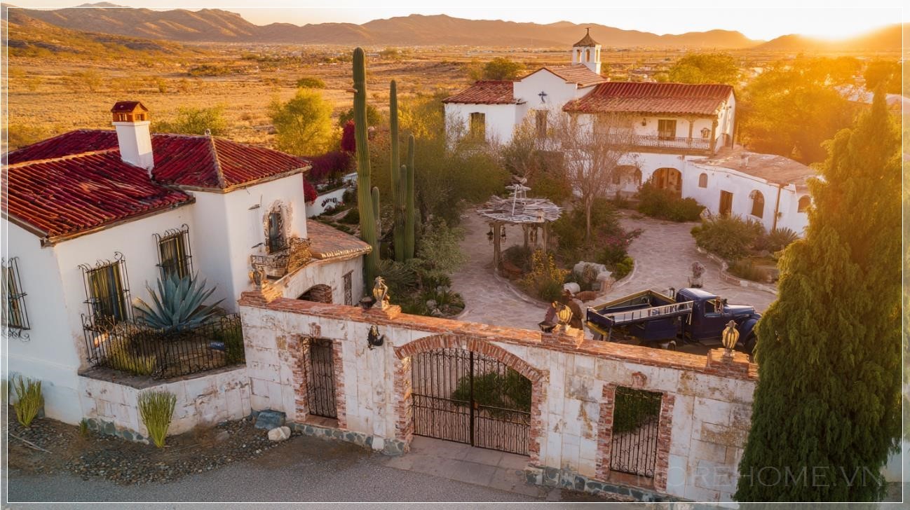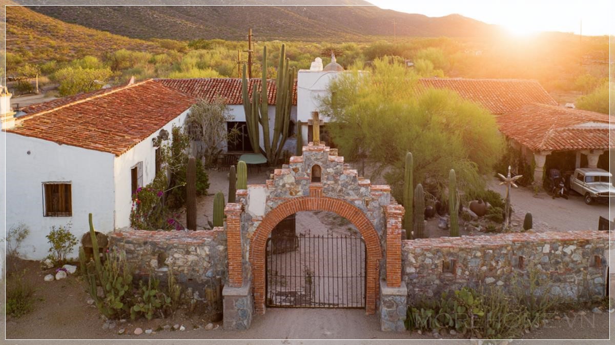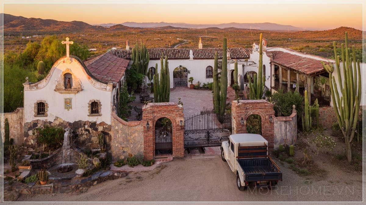 Khi ánh mặt trời cuối ngày nhẹ nhàng phủ lên những ngọn đồi xa xa, một khung cảnh như tranh vẽ hiện ra trước mắt - một trang trại cổ kiểu Mexico với những bức tường đá trắng ấm áp và mái ngói đất nung đã phai màu theo thời gian. Đây không chỉ là một công trình kiến trúc, mà là một câu chuyện sống động về lịch sử, văn hóa và nghệ thuật sống của người Mexico.