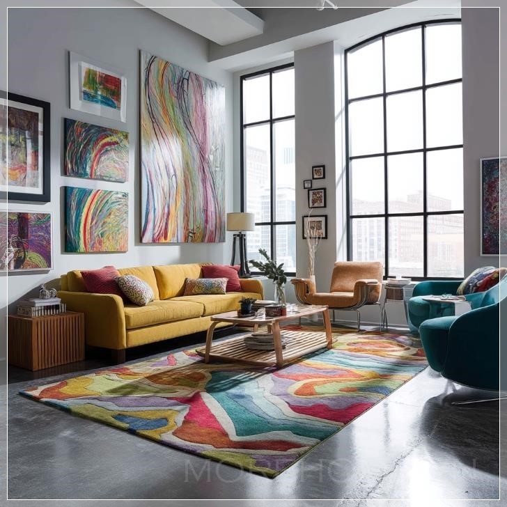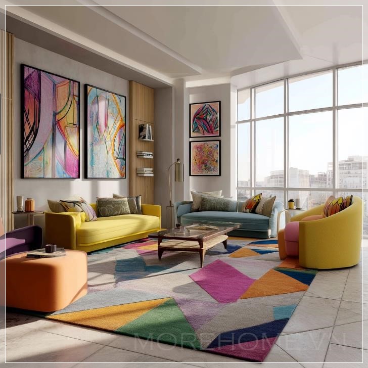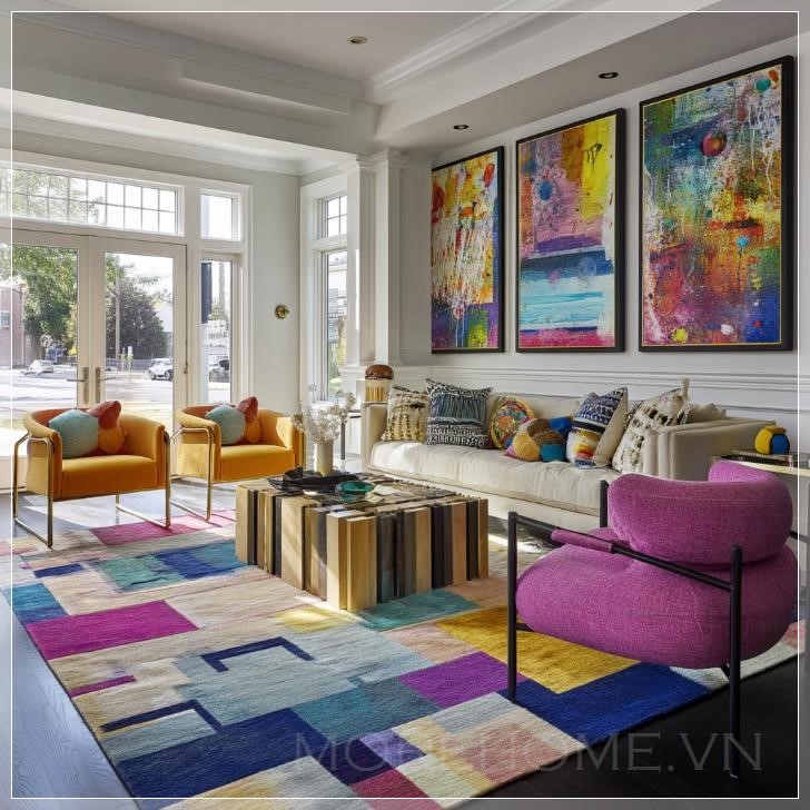 Thảm trải sàn với những họa tiết hình học táo bạo trở thành điểm nhấn ấn tượng, như một bức tranh khổ lớn được trải dưới chân. Những đường nét sắc sảo, những hình khối đan xen tạo nên chuyển động thị giác, khiến cho không gian tĩnh lặng bỗng trở nên năng động và đầy sức sống. Sự kết hợp giữa các tông màu ấm như cam đất nung với những gam màu lạnh như xanh dương navy tạo nên độ sâu và chiều kích cho toàn bộ căn phòng.