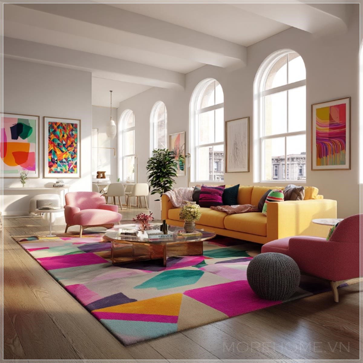 Bước vào không gian phòng khách hiện đại này như đang bước vào một bức tranh sống động, nơi mỗi góc cạnh đều kể một câu chuyện riêng về phong cách và cá tính. Ánh sáng tự nhiên dịu dàng từ những ô cửa sổ lớn tràn ngập không gian, tạo nên một bầu không khí ấm áp và mời gọi, khiến cho những sắc màu rực rỡ của nội thất trở nên sống động hơn bao giờ hết.