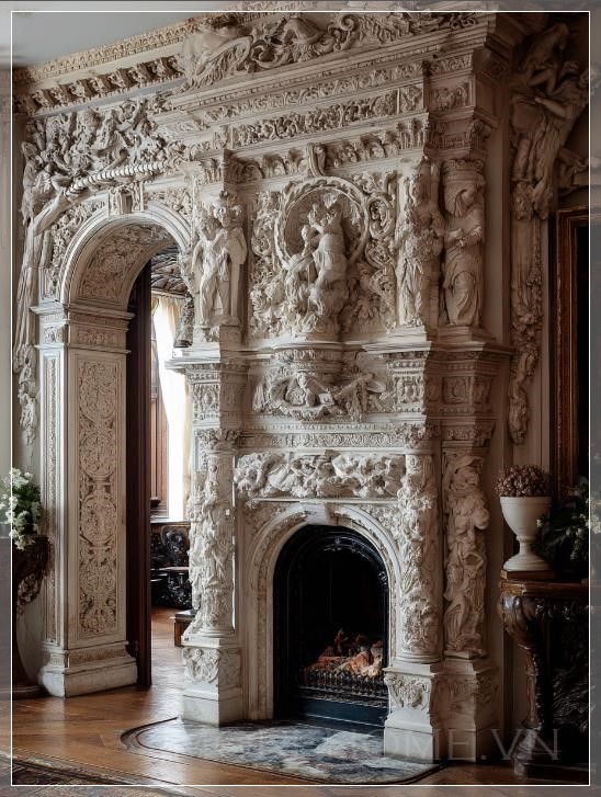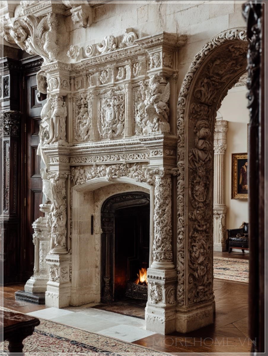 Lò sưởi này không chỉ là một điểm nhấn về mặt thẩm mỹ mà còn là một biểu tượng của sự sang trọng và lịch sử. Những đường nét uốn lượn mềm mại, hòa quyện với các chi tiết chạm khắc trên đá, khiến cho bất kỳ ai bước vào cũng cảm nhận được sự vĩ đại của quá khứ được tái hiện trong không gian hiện đại. Bên cạnh đó, các vòm cửa được thiết kế tinh tế, mở ra những cánh cửa dẫn lối vào các phòng khác, mỗi phòng lại mở ra một câu chuyện riêng biệt, tạo nên một hành trình khám phá thú vị trong chính ngôi nhà.