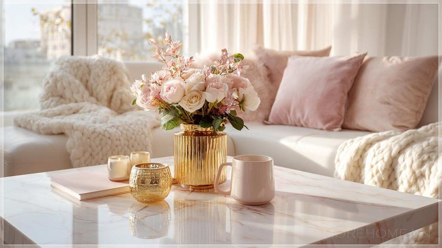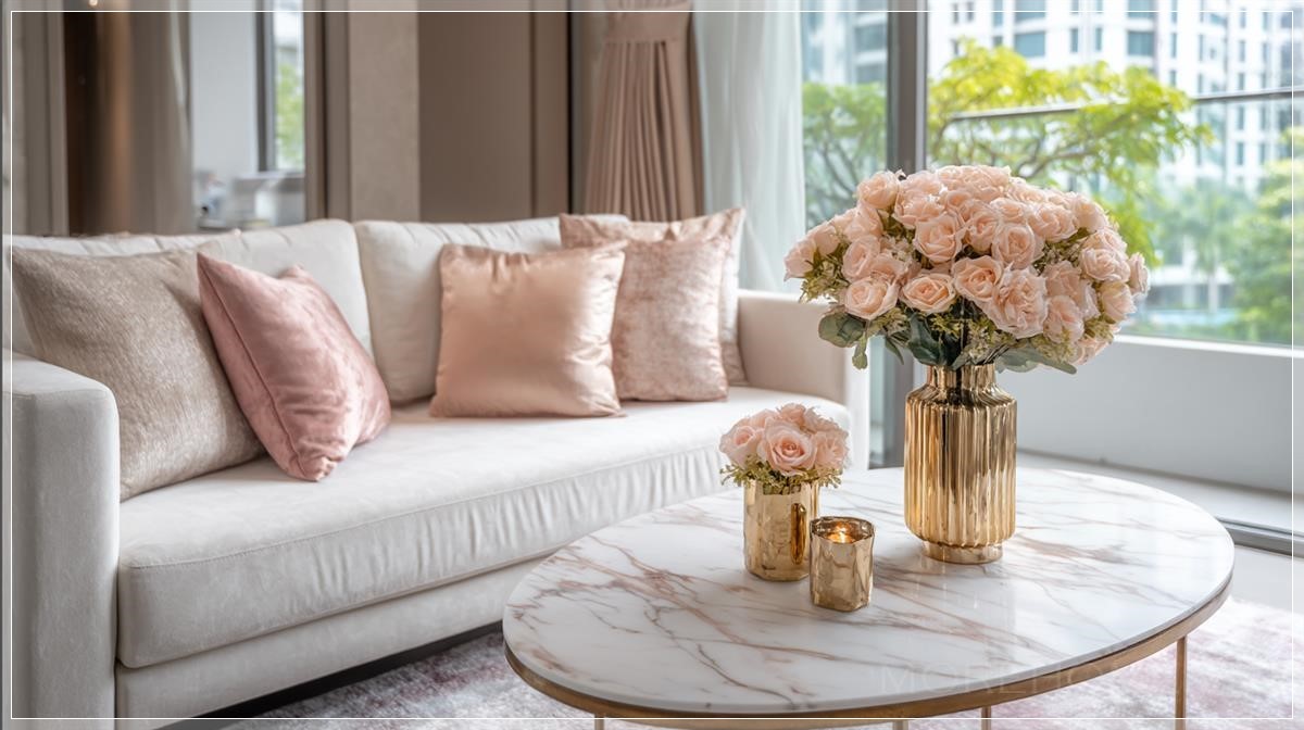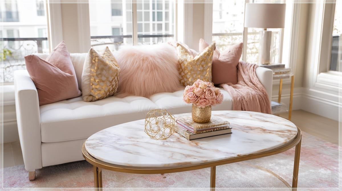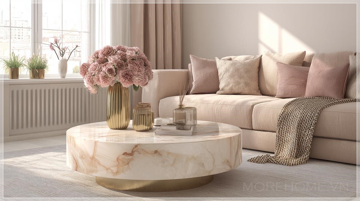 Không gian phòng khách này, được chiếu sáng bởi ánh sáng cửa sổ ấm áp, tạo ra không khí dễ chịu cho những buổi chiều thư giãn hay các cuộc trò chuyện thân mật. Màu sắc blush và vàng không chỉ tạo nên sự nữ tính mà còn mang lại cảm giác nhẹ nhàng, dễ chịu cho người sử dụng. Chất liệu đá marble với bề mặt mịn màng và khả năng phản chiếu ánh sáng khéo léo càng làm nổi bật các chi tiết trong không gian. Việc lựa chọn những món đồ trang trí như đèn bàn hay các vật dụng nhỏ gọn với thiết kế tinh tế, màu sắc nhẹ nhàng sẽ giúp không gian thêm phần hoàn hảo.