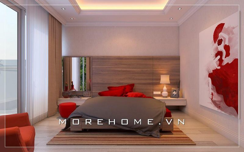 Nội thất phòng ngủ gỗ công nghiệp hiện đại cùng với chi tiết màu đỏ đặc biệt sẽ tạo nên sự cá tính và độc đáo cho chủ nhân của căn phòng.