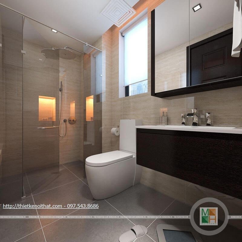 . Nếu bạn đang tìm kiếm một mẫu thiết kế phòng tắm đẹp, sang trọng với gam màu xám và chất liệu gỗ óc chó, thì ý tưởng thiết kế nội thất phòng tắm tại biệt thự Vinhomes Imperia Hải Phòng sẽ là một gợi ý khá ấn tượng.